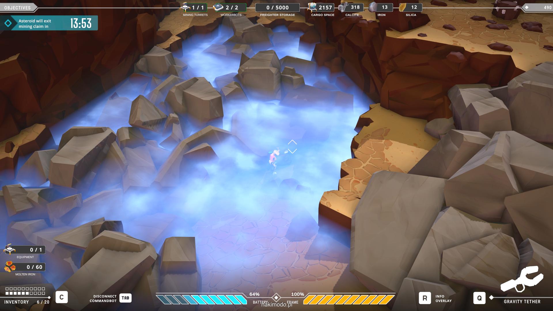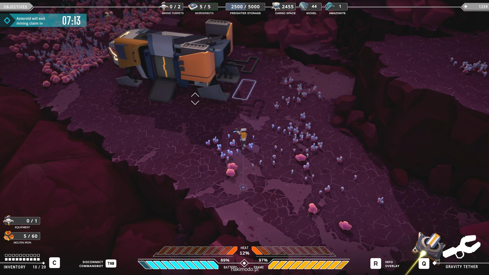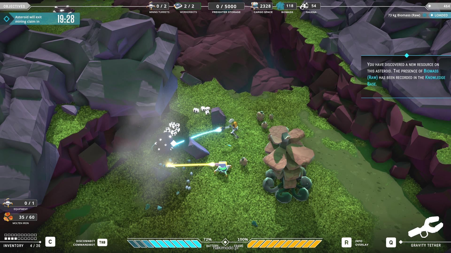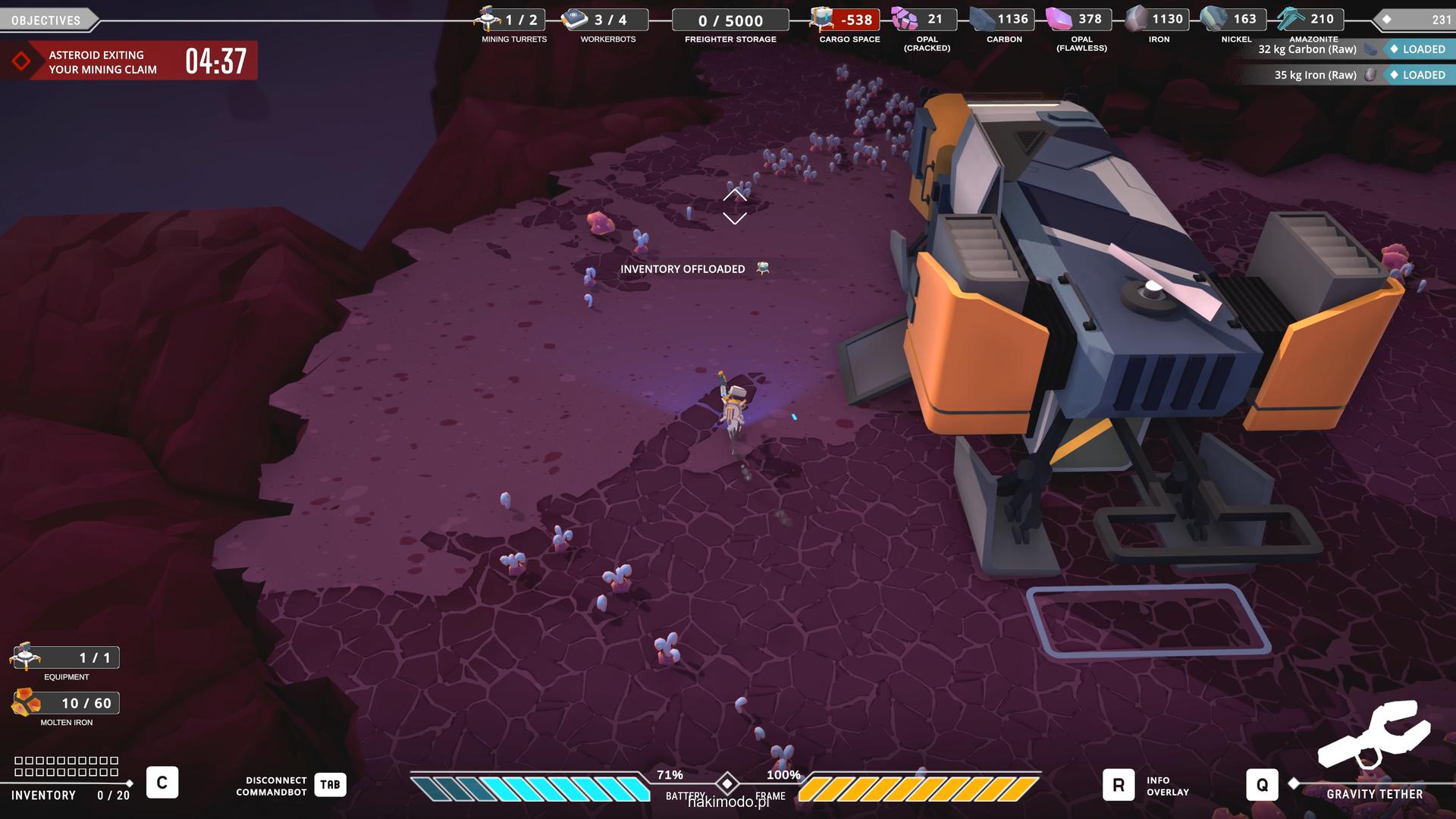 Naszym głównym celem jest zebranie jak największej ilości surowców w dostępnym czasie i przetransportowanie ich do ładowni wahadłowca. Warto zatem zacząć od najbardziej wartościowych minerałów. Pomaga w tym magnetyczny chwytak, którym przeciągamy obiekty lub wyrzucamy je, obracając się i nadając im pęd. Po dostarczeniu surowca w pobliże ładowni zostaje on automatycznie wciągnięty do środka.