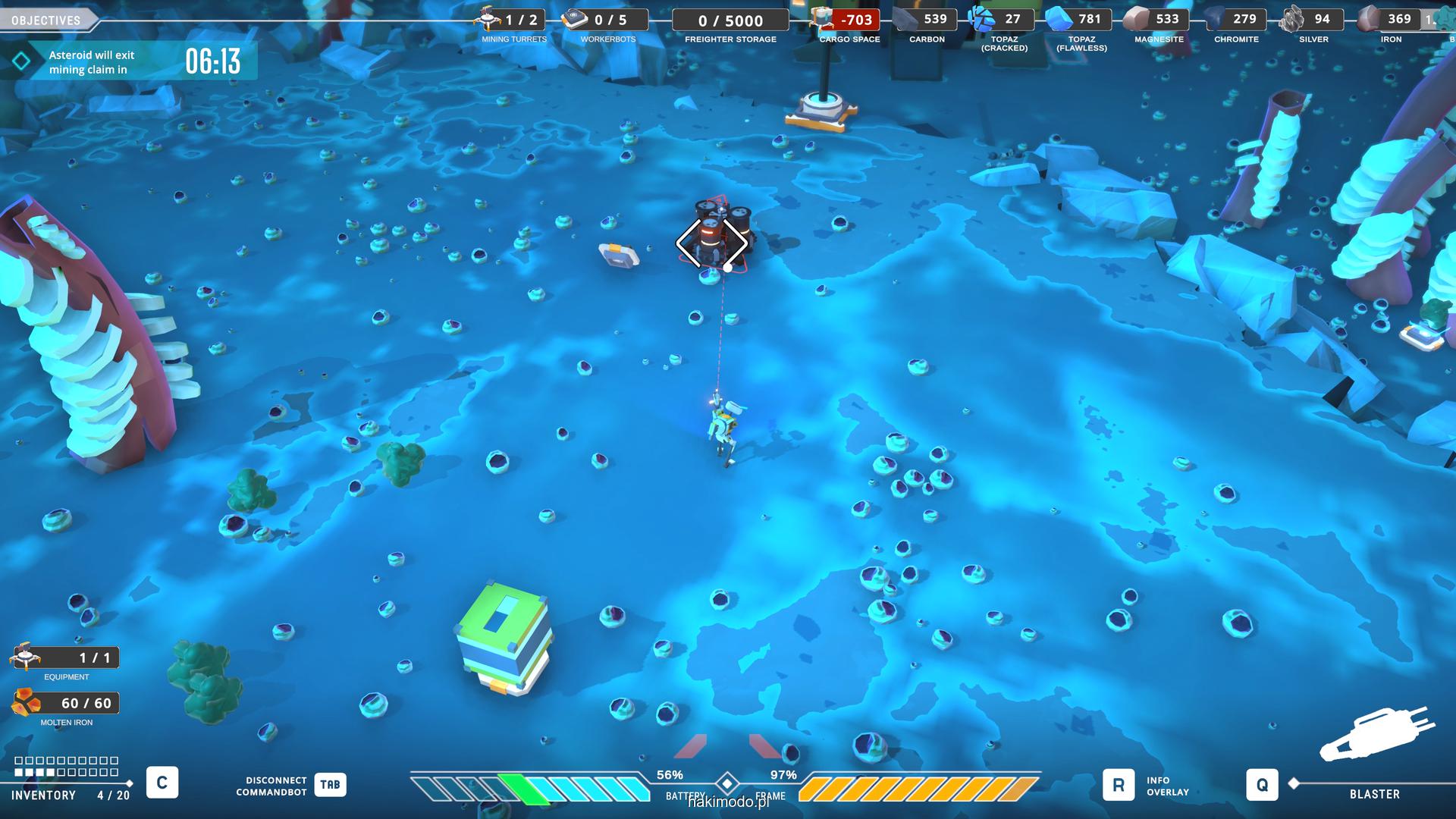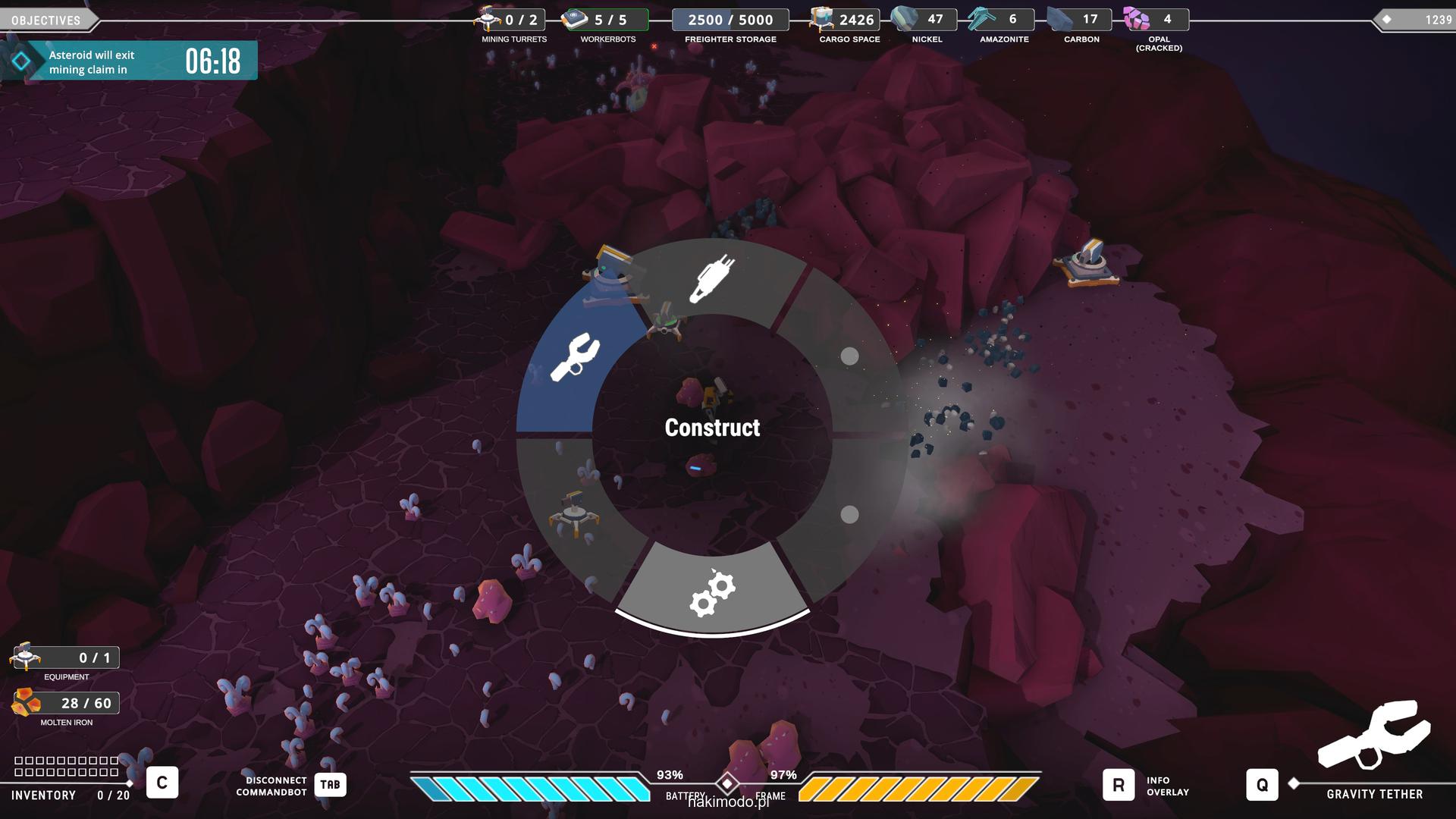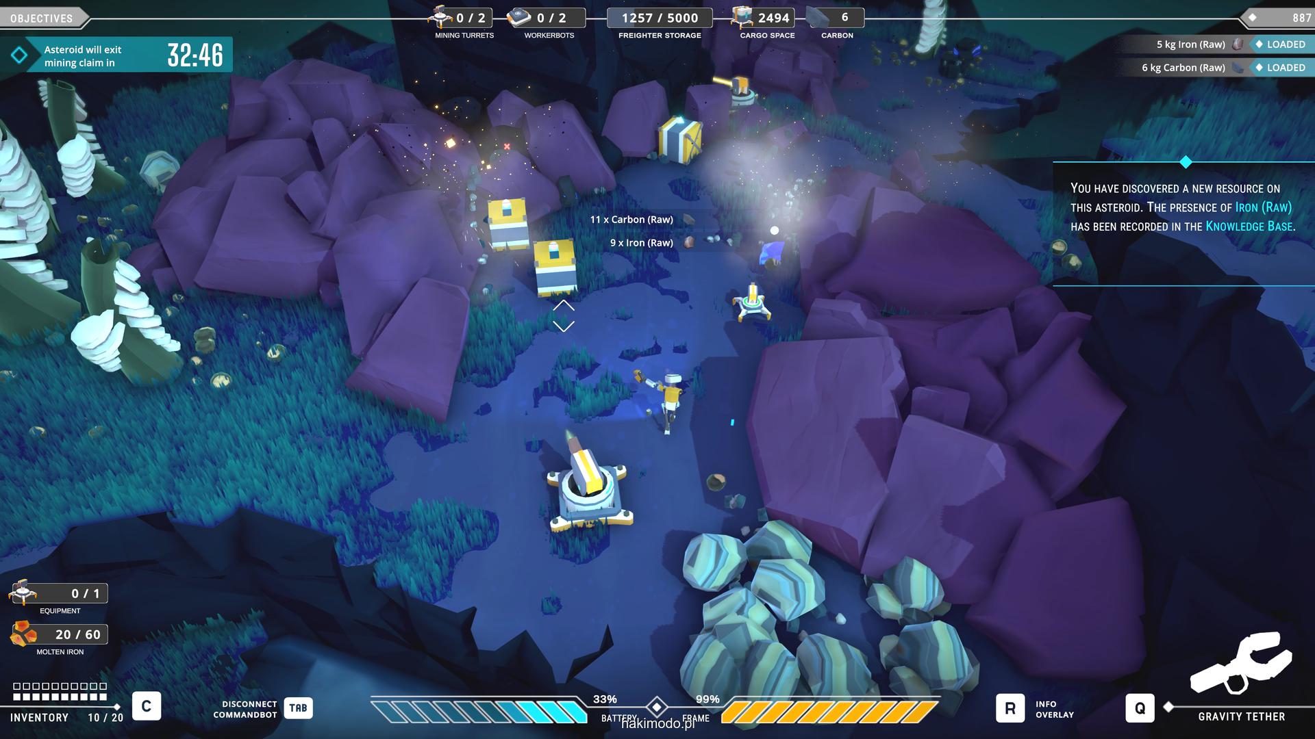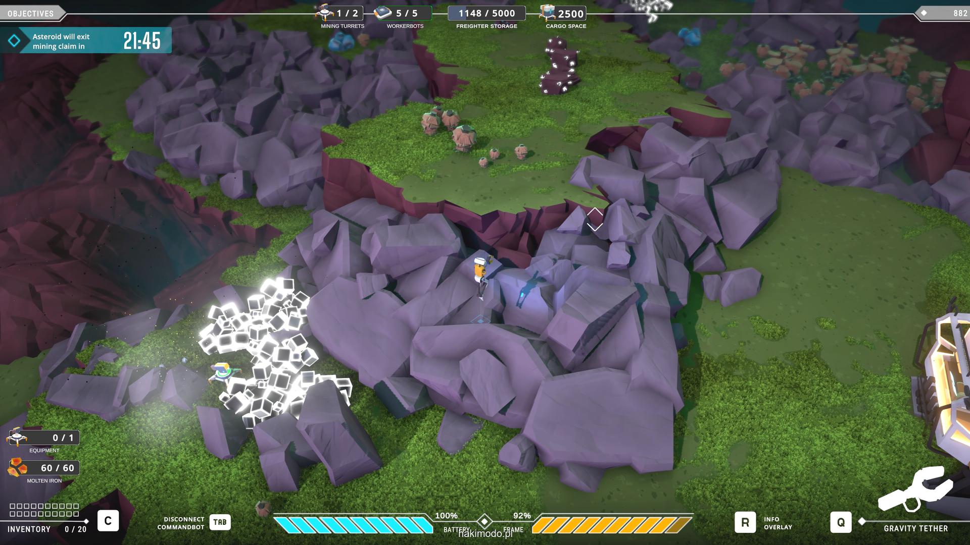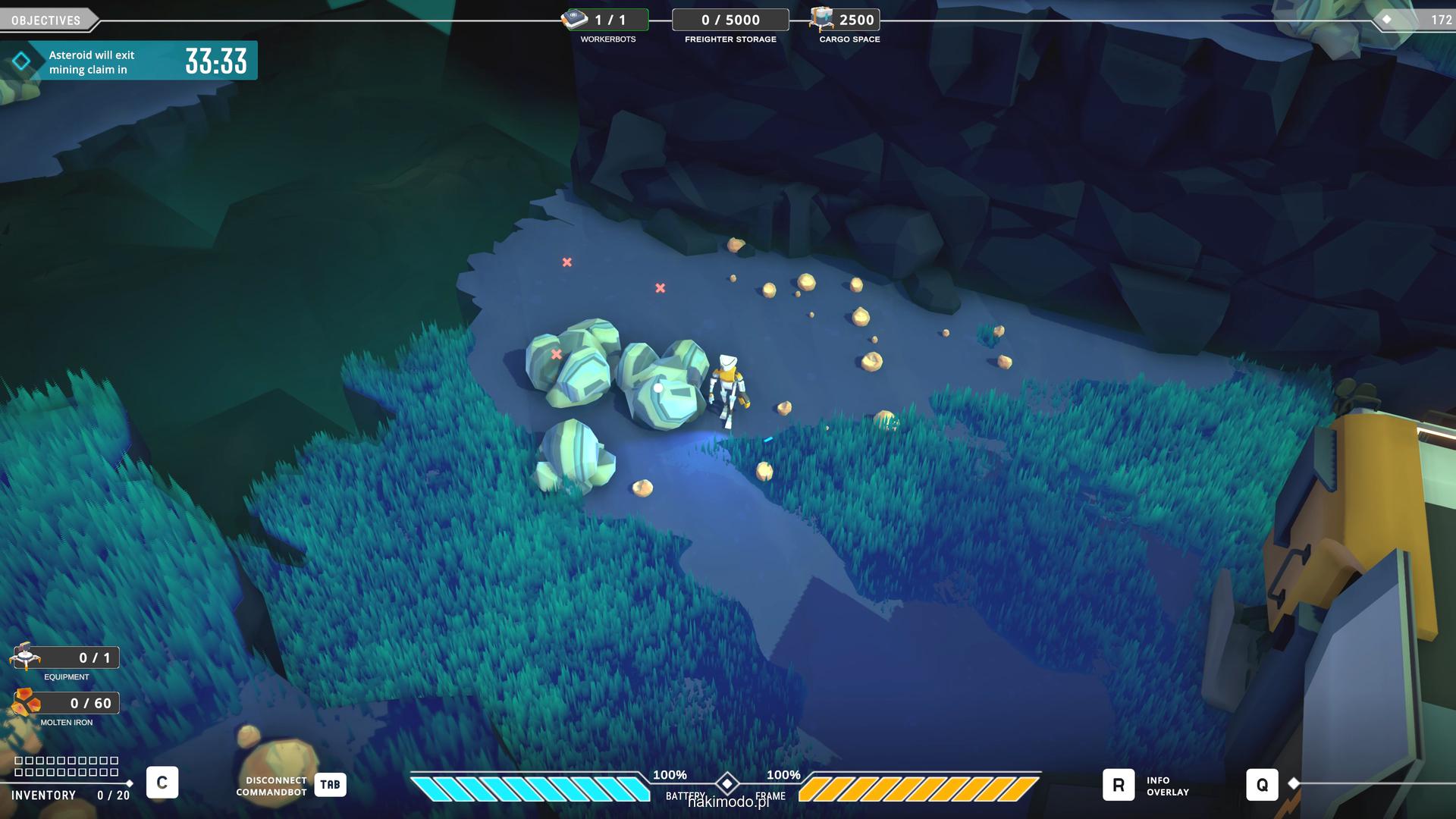 Naszym głównym celem jest zebranie jak największej ilości surowców w dostępnym czasie i przetransportowanie ich do ładowni wahadłowca. Warto zatem zacząć od najbardziej wartościowych minerałów. Pomaga w tym magnetyczny chwytak, którym przeciągamy obiekty lub wyrzucamy je, obracając się i nadając im pęd. Po dostarczeniu surowca w pobliże ładowni zostaje on automatycznie wciągnięty do środka.
