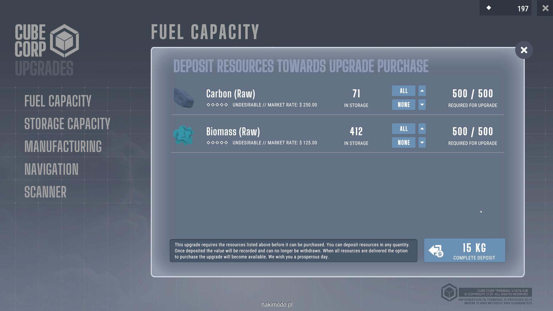 Po powrocie na stację sprzedajemy surowce, naprawiamy statek, tankujemy i możemy zakupić ulepszenia. Część ulepszeń wymaga nie tylko gotówki, ale i dostarczenia konkretnych materiałów – również tych, których nie można pozyskać bezpośrednio. Pomaga w tym rozbudowa statku o moduły przetwarzające, jak kruszarka czy piec hutniczy, które umożliwiają tworzenie bardziej złożonych komponentów.
