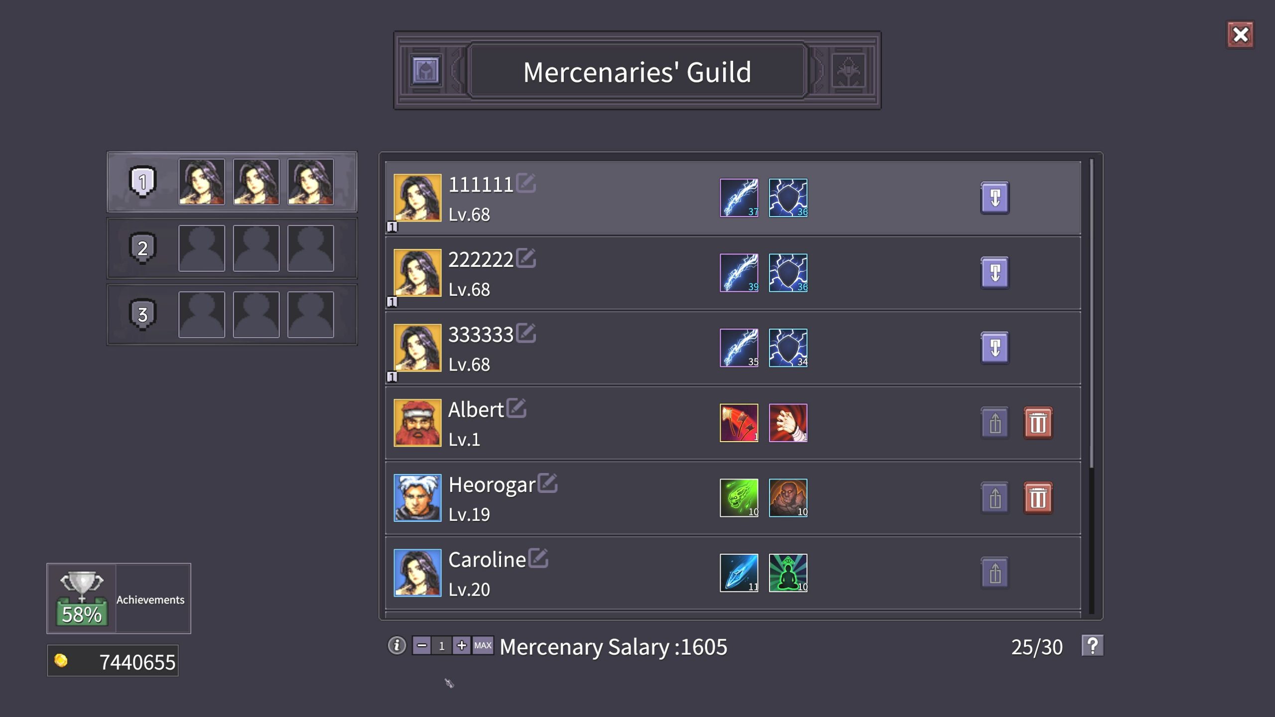 W skład drużyny wchodzi trzech wojowników a mogą to być postaci barbarzyńcy, łucznika, palladyna, maga lub nekromancera. Każdego z najemników możemy pozyskać w miejscowej tawernie, w drodze losowania kuponów, jakie bezpłatnie pozyskujemy w trakcie starć. Każdy z nich posiada dwie losowo nadane niezmienne zdolności magiczne więc czasami trzeba nieco poczekać z losowaniem nim trafi się postać z żądanymi przez nas dwoma parametrami. Dodatkowo rekruterzy mają też niejako określoną rzadkość, określaną literą i kolorem tła, zwiększającą się po przebyciu określonej części mapy. Wojownika nie można promować do wyższej klasy zatem pozostaje wymiana w zespole i ponowne jego wyszkolenie.
