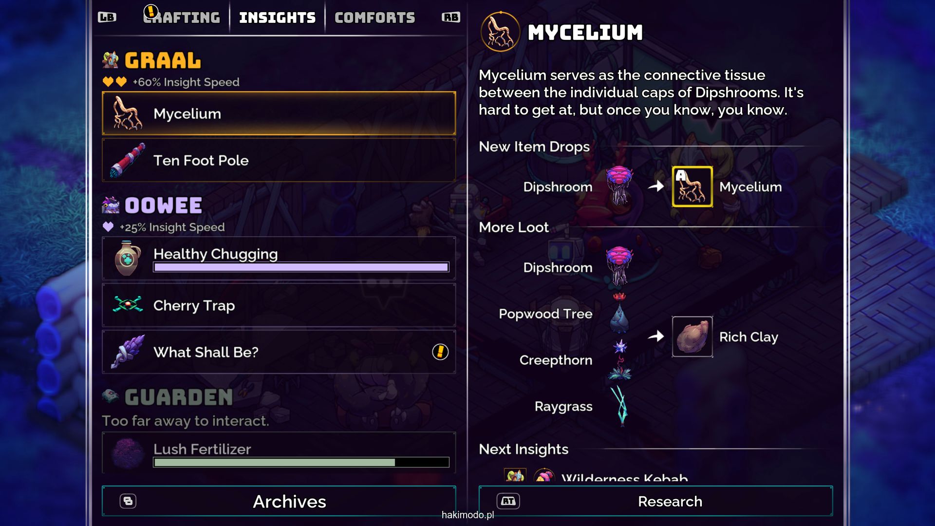 Będziemy także mogli odkrywać nowe technologie, dające nam dostęp do nowych broni, dekoracji czy też elementów konstrukcyjnych. Nie realizujemy tego osobiście, w tym celu musimy zwrócić się do zaprzyjaźnionych NPC, którzy będą nas też prosić o drobne przysługi co odblokuje kolejne badania. Jakie? Rozbudowę pokoju jaki zajmują, dodanie doń elementów dekoracyjnych, stworzenie nowego typu stołu do craftingu czy też zabranie go jako towarzysza podróży w wyszczególnione miejsce na mapie. Praca nad wynalazkami nic nas nie kosztuje jednakże musimy odczekać odpowiednią ilość czasu nim zostanie on przebadany. Wielokrotnie zwiększają one ilość surowców jakie pozyskujemy w drodze zbierania roślin czy też eliminacji napotykanych stworzeń, dając dostęp do nowych przedmiotów i technologii. Wynalazków także jest dużo zatem przygotuj się na dłuższą rozgrywkę…