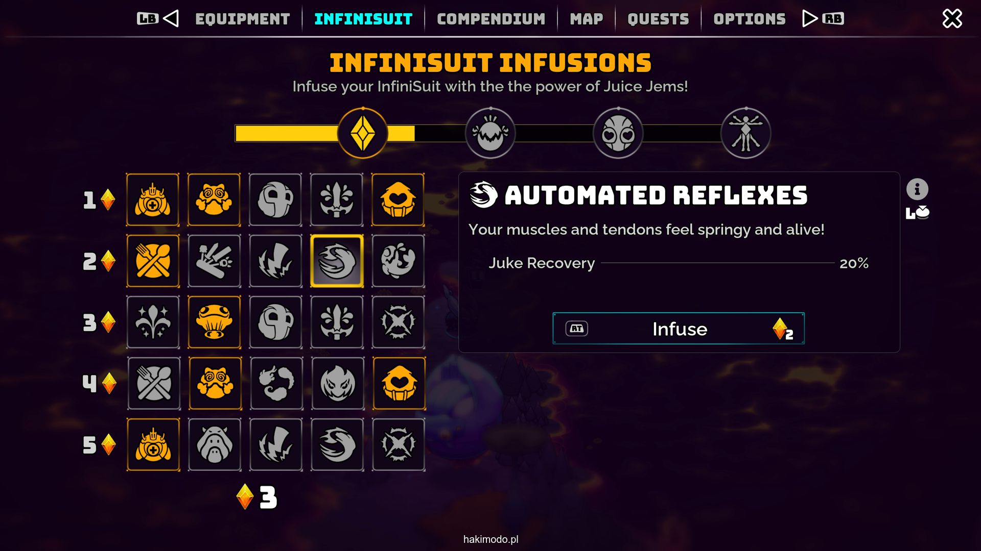 Po odblokowaniu nowych elementów opancerzenia musimy je samodzielnie wykonać. Ciekawostką jest, że każde wytworzenie pancerza losuje jego parametry bazowe, co dodaje lekki element losowości. Nasza postać może założyć hełm, pancerz, rękawice i buty, a chyba najważniejszym dla nas parametrem jest ilość punktów życia — która szczególnie istotna jest podczas walk i przebywania w zatrutych lokacjach.